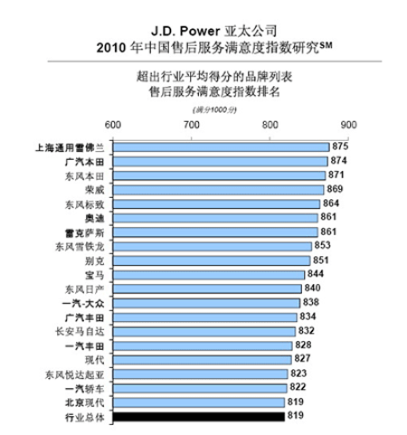 2010年中國售后服務滿意度指數調研主要是衡量車主在購車的12至24個月期間,對中國市場授權經銷商提供的保養和維修服務的滿意度。報告評測了五個要素:服務質量、服務后交車、服務啟動、服務顧問以及服務設施。設置總分為1000分,前三名分別獲得875、874、871的評分。