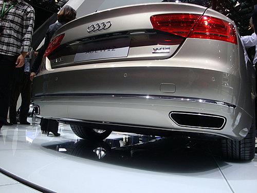 全新奧迪A8L W12 quattro在車身外觀上還有一系列的改進,包括單幅式水箱進氣格柵,其中間為鉻金屬噴涂的橫條裝飾。在其空氣通風口以及側后視鏡邊緣還擁有鉻金屬的嵌入物裝飾。其進氣格柵處及車尾還配有W12的標志,以顯示該車身份的不同。梯形的雙尾氣排放管與后保險杠完美的結合在一起。