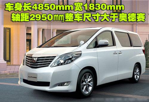 目前日本本土銷售的豐田Alphard是其第二代車型,分為兩驅和四驅兩個版本,兩驅車型的車身長4850mm 。寬1830 mm ,高1890mm,四驅車型的車身長為4850 mm ,車寬1830 mm ,高1905mm,而軸距均為2950mm。