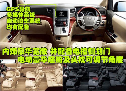 在配置方面,豐田Alphard高配版配備了電動控制的側滑門、中置式大型電動天窗、內置GPS導航及硬盤的多媒體系統、6碟DVD/CD影音系統帶8喇叭、自動泊車系統、前后泊車雷達。車廂內飾則提供了米色與黑色兩種內裝顏色供用戶選擇。