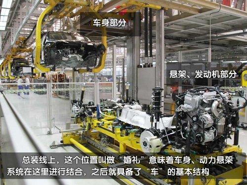 這里是一汽大眾長春第二工廠的總裝車間,車輛門在這里完成“最后的儀式”。在總撞車間的門口可以看到這里生產的每一款車型,打頭的一臺速騰解剖車非常吸引大家的注意(我們隨后會有單獨文章詳細介紹)。從前一工序的噴漆線來到總裝線的準新車都在天上“飛著”。而等到車輛從天上降落到地上之后車輛距離生產完畢就很快了。