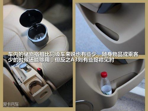 車內的儲物格相比同級車來說有些少,移動煙灰缸占用了一個杯架,手機、煙盒等等則占用了另一個,而杯架真正的主人只能放在車門上了。其方向盤左側提供了一個儲物格,只是這個儲物格開開關關的實在不方便,所以只能放洗車卡之類的不太常用的東西。也許這么看A3的儲物格夠了,可是如果隨身的東西再多一些,A3的儲物空間就捉襟見肘了。