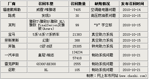 從上面的統(tǒng)計(jì)表可以看出,從10月14日開始召回公告頻頻發(fā)布,僅15日一天就有4個(gè)品牌實(shí)施召回,而它們還是市場中的豪華品牌甚至超豪華品牌如勞斯萊斯、賓利,奔馳、寶馬也沒有落后分別召回其主力車款寶馬5系、7系和C級(jí)、E級(jí)。曾備受關(guān)注的豐田品牌再次實(shí)施召回,這次是皇冠和銳志總召回接近20萬輛。而在召回原因中,制動(dòng)系統(tǒng)問題占了很大的比重,這點(diǎn)有點(diǎn)令消費(fèi)者擔(dān)心。