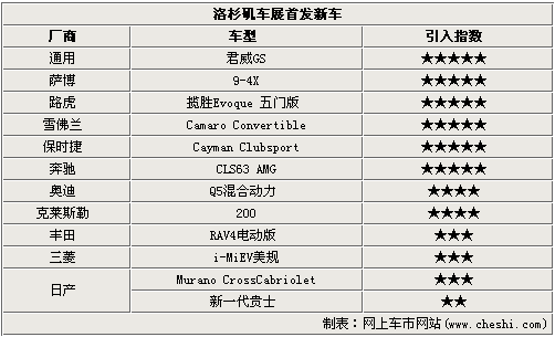 在這屆洛杉磯車展上,12款新車首發涵蓋了美、德、日等廠商,在車型類型則有轎車、敞篷跑車、SUV、MPV等,除此之外還有純電動車登場。這其中君威GS、9-4X、攬勝Evoque 五門版等6款車預計明年引入國內,其他如奧迪Q5混合動力、克萊斯勒200、純電動RAV4也有引入的可能。