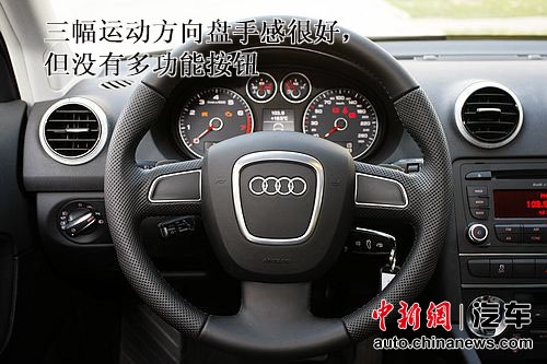 A3的方向盤手感著實(shí)不錯(cuò),兩側(cè)皮質(zhì)上的花紋大大增強(qiáng)了握感和防滑性,大小也相當(dāng)適中。只是讓我大惑不解的是,為什么在一輛售價(jià)30余萬(wàn),配備了自動(dòng)空調(diào)、方向盤換擋撥片、電動(dòng)座椅調(diào)節(jié),甚至自動(dòng)泊車系統(tǒng)的車型上,竟然沒(méi)有裝備小小的多功能方向盤?