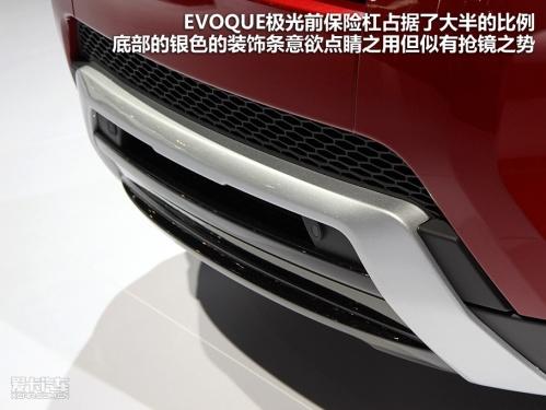 EVOQUE極光前進氣格柵之下前保險杠占據了大半的比例,底部的銀色的裝飾條意欲點睛之用,但似有搶鏡之勢,發動機艙蓋上的進氣口尚不知其效用究竟有多大,想必美觀之用是其最大的作用吧。