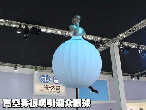 一個(gè)高高的桿子上面裝了一個(gè)雪白的球,球里面竟然冒出一個(gè)金發(fā)碧眼的美女!在大眾的展臺(tái)前,三位外國(guó)模特吸引了無(wú)數(shù)觀眾圍觀。 只見(jiàn)洋美女穿著雪白的裙子,爬上了一根高達(dá)3米的桿子,然后從腳下生出一個(gè)“雪球”,“雪球”把人的下半身都包裹在內(nèi),只露出上半身。三個(gè)高桿,三位美女,在空中擺出各種舞蹈姿勢(shì),瞬間秒殺了無(wú)數(shù)相機(jī)。