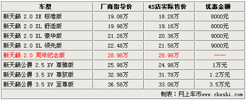 2009年6月16日,東風(fēng)日產(chǎn)推出了新天籟周年紀(jì)念版車型,售價(jià)為28.98萬(wàn)。這款新車是在天籟2.5L車型的基礎(chǔ)上,增加了BOSE5.1ch環(huán)繞音響系統(tǒng)和超大型雙層全景天窗等舒適性配置,大大提升了這款車的性價(jià)比。近日,記者在走訪北京地區(qū)的東風(fēng)日產(chǎn)4S店時(shí)了解到:目前新天籟周年紀(jì)念版還沒有現(xiàn)車到店,目前預(yù)定的消費(fèi)者將在7月底提到現(xiàn)車。
