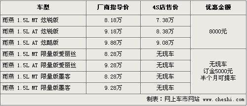 據4S店銷售人員介紹,雨燕目前現車只有普通版車型,限量版車型廠家產量較少,消費者買到話需要訂購,訂金為5000元左右,半個月左右能夠提到現車。限量版比普通版主要增加了真皮座椅,相比配置較高。在價格方面,普通版最高可以優惠現金8000元,優惠后最低售7.38萬元。現車有紅色、黑色等款可挑選。