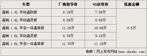 據(jù)記者走訪北京多家斯柯達經銷店獲知,近期購買斯柯達晶銳的消費者可以得到全系6000元的優(yōu)惠。經優(yōu)惠后,入門級的斯柯達晶銳1.4L手動晶致版售價從8.19萬元下降到了7.59萬元。頂配的1.6L手自一體晶享版售價從11.79萬元降到了11.19萬元。