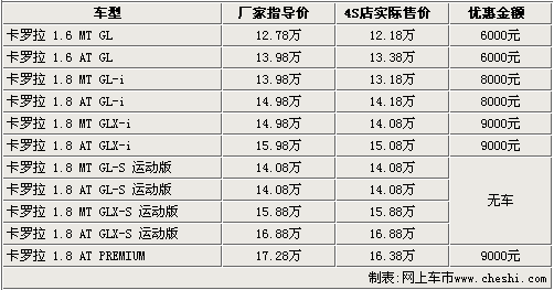 卡羅拉是一汽豐田于旗下的主力經(jīng)濟(jì)型轎車,上市后憑借著時(shí)尚的外觀贏得了消費(fèi)者的喜愛(ài)。一汽豐田在5月宣布:對(duì)COROLLA卡羅拉全系車型進(jìn)行配置升級(jí),不僅增加了泊車?yán)走_(dá)、倒車影像等裝備。據(jù)網(wǎng)上車市價(jià)格監(jiān)測(cè)系統(tǒng)顯示:目前在北京地區(qū)一汽豐田4S店購(gòu)買卡羅拉的消費(fèi)者,最高可享受到9000元的現(xiàn)金優(yōu)惠。具體車型見下表: