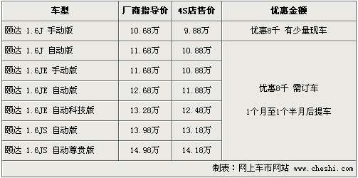 據東風日產4s店銷售人員介紹,目前頤達全系車型現金優惠8千元。經優惠后,入門級的1.6J 手動版車型售價從10.68萬元下降到了9.88萬元,高配的1.6JS 自動尊貴型售價也下降到了14.18萬元。北京地區4S店目前只有個別1.6J時尚版車型,其他款車型無現車,欲購買者需交1000元訂金約等1個月至1個半月的時間。北京地區各4S店由于訂單不同,各店銷售的現車顏色有所不同。