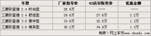 歐藍德是三菱引入國內銷售的中型SUV車型,同時歐藍德也是三菱汽車第一款采用轎車底盤形式生產(chǎn)的SUV車型。近日我們從三菱汽車官方獲悉到,全新一代的歐藍德車型將于10月13日正式上市,首次推出的車型分為2.4和3.0兩種排量,共計4款車型。與此同時根據(jù)網(wǎng)上車市價格監(jiān)測系統(tǒng)顯示,目前銷售的09款歐藍德全系均出現(xiàn)了大幅優(yōu)惠,最高降幅高達2.2萬元。具體車型售價見下表: