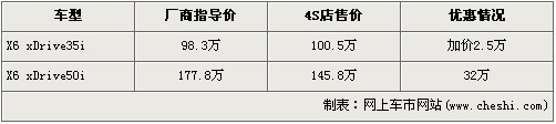 據(jù)北京寶馬經(jīng)銷店銷售人員介紹,現(xiàn)在在售的X6車型分為售98.3萬(wàn)元的35i車型和售價(jià)為177.8萬(wàn)元的50i兩款車型。目前購(gòu)買35i車型的消費(fèi)者沒(méi)有優(yōu)惠,提現(xiàn)車還要加價(jià)2.5萬(wàn)元,售價(jià)從98.3萬(wàn)元上升到了100.8萬(wàn)元,排量更大的4.4升的50i車型有32萬(wàn)元的現(xiàn)金優(yōu)惠,售價(jià)降到了145.8萬(wàn)元。銷售人員還介紹,近期50i車型車型沒(méi)有現(xiàn)車,消費(fèi)者需交訂金10萬(wàn)元,下個(gè)月可提車。