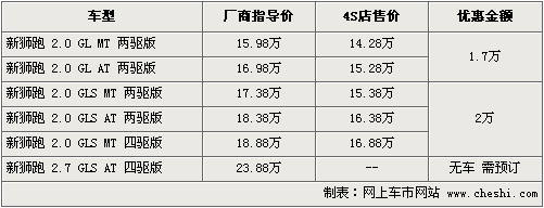 東風(fēng)悅達(dá)起亞獅跑和北京現(xiàn)代途勝屬于同平臺(tái)車型,但相比途勝,獅跑外觀更有活力。現(xiàn)售的09款獅跑,時(shí)尚的外觀和改款后配置的重新升級(jí),使獅跑在同級(jí)別中的性價(jià)比進(jìn)一步提升。根據(jù)網(wǎng)上車市價(jià)格監(jiān)測(cè)系統(tǒng)顯示,目前獅跑最高優(yōu)惠現(xiàn)金2萬元,具體行情如下: