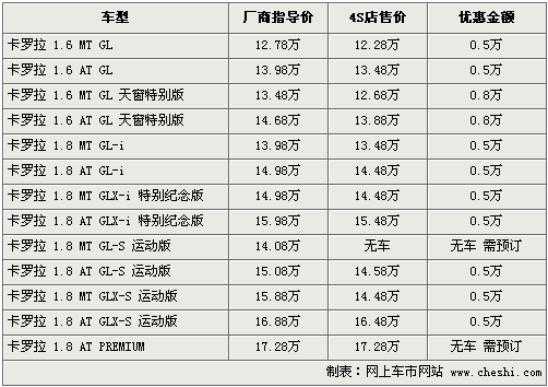 筆者目前了解,卡羅拉新推出的1.6天窗特別版車型目前有現(xiàn)車供應(yīng),但高配紀(jì)念版和運動版車型現(xiàn)車仍然供應(yīng)比較緊張,需要消費者預(yù)訂。目前天窗特別版車型最高可優(yōu)惠現(xiàn)金8000元,其他車型可優(yōu)惠5000元左右。全系十多款車型中,1.6天窗特別版相比性價比較高,消費者可以考慮購買。