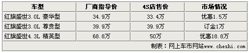 紅旗轎車在中國(guó)可謂是國(guó)貨中的精品,紅旗盛世車型對(duì)大家來說更不會(huì)陌生。單憑曾經(jīng)擔(dān)任過各大重要會(huì)議指定用車這一點(diǎn),就證明了紅旗盛世的超高品質(zhì),更何況還一度加盟首汽國(guó)賓隊(duì),作為中國(guó)的驕傲服務(wù)國(guó)際友人。一直以來一向以中央機(jī)關(guān)和外事接待任務(wù)為主的紅旗盛世,現(xiàn)在離老百姓的生活也很近,很多一直喜歡紅旗轎車的朋友都很關(guān)注盛世的市場(chǎng)情況。就此,網(wǎng)上車市走訪了一汽紅旗北京地區(qū)4S店,了解到紅旗盛世最新的市場(chǎng)情況,具體信息請(qǐng)參考下表: