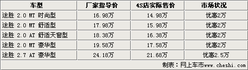 北京現(xiàn)代途勝是韓系車中非常經(jīng)典的一款城市型SUV,寬大的空間,時(shí)尚的外觀以及人性化的配置使眾多消費(fèi)者都鐘情它,從上市到現(xiàn)在在SUV市場中一直有著不錯(cuò)的銷量。近日根據(jù)網(wǎng)上車市價(jià)格監(jiān)測系統(tǒng)顯示,目前購買現(xiàn)代途勝車型最高可以得到2.5萬的現(xiàn)金優(yōu)惠。具體車型見下表: