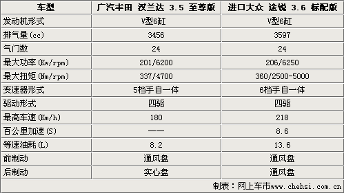 這兩款SUV車型均搭載的是V型6缸發動機,排量都在3.5升這個區間。但是在發動機技術上卻存在著本質區別。廣汽豐田漢蘭達的發動機配備了雙VVT-i技術,實現了卓越的動力輸出,同時進一步提高了燃油經濟性。進口大眾途銳則配備的是動力更加突出FSI發動機,該發動機采用燃油缸內直噴技術,這一點從最大功率和最大扭矩的輸出就可以看出。在變速器方面途銳則是略勝一籌,配備了6速手自一體變速箱,令變速更平滑順暢,該變速器還帶有DSP的智能動力換檔系統,能辨認出您的變速習慣,使駕駛員充分享受到駕駛的樂趣。進口大眾途銳剎車系統采用的是散熱性能良好的前后通風盤,漢蘭達采則采用的是前通風后實心。