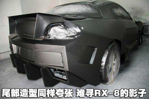RX-8改裝版的尾部造型雖然與蘭博基尼蓋拉多不太相像,但夸張的造型令人印象深刻,上翹的后尾翼、碩大的后底部導流槽,方方正正的造型絕對很奪人眼球。