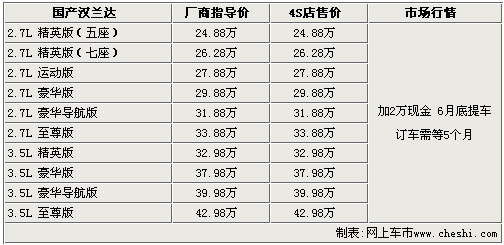 2009年5月25日,廣州豐田正式推出了SUV車型漢蘭達(dá),售價(jià)24.88—42.98萬元。作為一款日系經(jīng)典SUV車型,這款車以進(jìn)口方式銷售時就得到了廣大消費(fèi)者的喜愛,此次國產(chǎn)后的漢蘭達(dá)增加了2.7升排量的車型,不僅使車系的價(jià)格較進(jìn)口車型降低不少,而且還增加了消費(fèi)者的選擇空間。目前國產(chǎn)漢蘭達(dá)的現(xiàn)車還沒有到店,急于提車的消費(fèi)者需要加價(jià)提車。