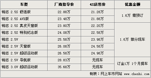 作為一款以運動著稱的后驅中級車,銳志在性能以及操控各方面表現(xiàn)都令人滿意,尤其是獨具個性的改裝潛力,讓很多癡迷運動的車迷們找到了充分的駕駛樂趣。筆者通過經(jīng)銷商處了解到,明年4月豐田將推出新款銳志車型,最快要在6月份后可以購買到,另外現(xiàn)款車型最高優(yōu)惠現(xiàn)金1.6萬元。具體車型行情如下: