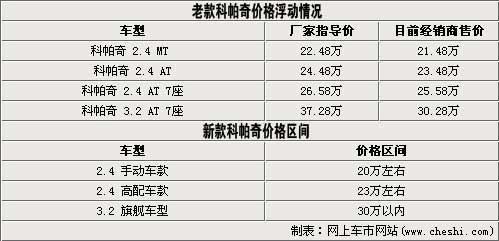 與此同時,2010年開始進口雪佛蘭科帕奇在北京市場的售價都以穩定的優惠幅度進行銷售。例如2.4升車型普遍優惠一萬元,實際售價僅為21.48-25.58萬;3.2升旗艦車型為30.28萬優惠幅度達到7萬元。那么現款科帕奇在優惠后的價格區間也恰好與內部人士透露的新款車型上市后的價位區間相近。