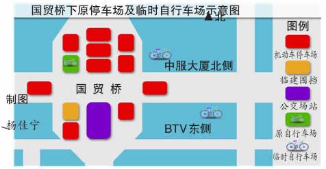 針對市民關注的自行車停放問題,CBD管委會表示,原有的自行車停車場將延時開放,同時就近開辟兩處自行車臨時停放場地。一處位于原自行車場地的東北側,中服大廈北側,停放自行車數量可達200輛,與原場地停放數量相當。