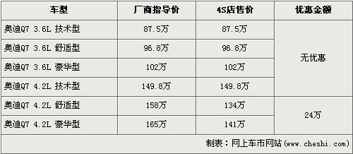 Q7是奧迪打造的第一款“高性能SUV”,同時也是奧迪引進中國的第一款頂級SUV車型。Q7憑借杰出的運動性、高超的操控性及沖擊性極強的外形在上市時就獲得了人們的關(guān)注。隨著在上海車展亮相的改款新Q7即將上市,在售的老款Q7已經(jīng)停產(chǎn)。目前在售的奧迪Q7出現(xiàn)了最高為24萬元的優(yōu)惠,具體詳情請看下表: