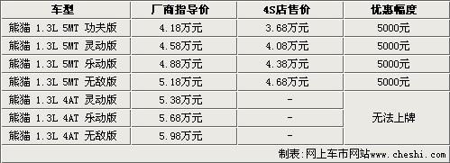 據吉利汽車4S店銷售人員介紹,熊貓1.3L手動擋車型目前都有現車銷售,而自動擋雖然已經上市,但由于北京地區無法上牌,所以還沒有現車抵達北京市場,預計最早會在今年8月份解決無法上牌的問題。目前熊貓1.3L手動擋全系可以優惠五千元,而這款車型還增加了電動升級后窗,需要在原價的基礎上加1000元。
