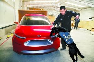 北京國際車展本月25日舉辦,目前空運展品已經大部分入境。為防止展品中夾藏違禁品,海關緝毒犬基地派出兩條訓練有素的緝毒犬協助關員現場查驗。張鵬 唐延智攝