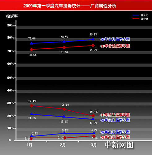 中新網4月24日電 日前,中國質量協會用戶委員會、車人網聯合發布了2009年一季度中國汽車產品質量與服務質量分析報告。統計顯示,相比去年同期,合資品牌車型的投訴增加較快,進口車投訴略有增加,自主品牌車型的投訴呈現遞減趨勢。