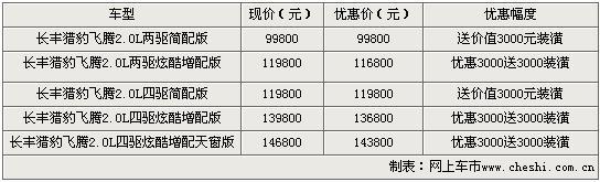 飛騰采用三菱最新研制的超級(jí)四輪驅(qū)動(dòng)系統(tǒng),使飛騰全身充滿活力。具有強(qiáng)勁的動(dòng)力性能和較好的平穩(wěn)性能。并且,具有低燃耗等優(yōu)點(diǎn)。近日根據(jù)網(wǎng)上車市價(jià)格監(jiān)測系統(tǒng)顯示,目前上海地區(qū)購買長豐獵豹累計(jì)最高優(yōu)惠6000元。具體車型售價(jià)見下表: