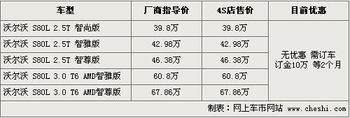 S80L加長版是沃爾沃專門為中國市場量身打造的一款全新豪華車,軸距加長140毫米,配置更加豪華,以滿足中國消費者的需求。國產加長版包括了2.5T和3.0兩個排量共5款車型。目前北京地區加長版車型現車緊缺,均需要提前預訂,具體行情如下: