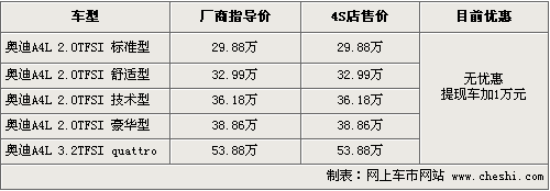 筆者從北京地區(qū)經銷商處了解到,目前奧迪A4L現車供應比較緊張,現車數量非常少,款式主要集中在2.0T舒適版和3.2兩款車,各4S店供車情況有一定差異。部分店提現車仍然需要加1萬元現金,或者在店內做1萬元裝飾。消費者如果訂車的話,需要交5000元左右訂金,等待一個月時間提車。