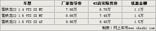 目前購買東風(fēng)雪鐵龍C2的消費者不僅可以享受到最高1.5萬元的現(xiàn)金優(yōu)惠,而且還能得到商家隨車贈送的部分車內(nèi)裝飾。據(jù)東風(fēng)雪鐵龍4S店銷售人員表示,目前只有C2運動版VTS的車型還在銷售,而且顏色比較單一,其余車型均沒有現(xiàn)車銷售。