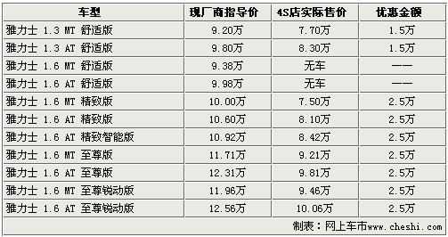 據(jù)廣州豐田4S店銷售人員介紹,目前廣州豐田各4S店內(nèi)雅力士1.3L現(xiàn)車較少,而1.6排量的車型就相對比較充足,并可提供試乘試駕服務(wù)。銷售人員表示,現(xiàn)在到店購買雅力士的消費者可享受到最高達2.5萬的價格優(yōu)惠,還可得到商家贈送的簡單裝飾等。消費者可在展廳內(nèi)近距離接觸展車、親身體驗試駕車后直接購買現(xiàn)車。