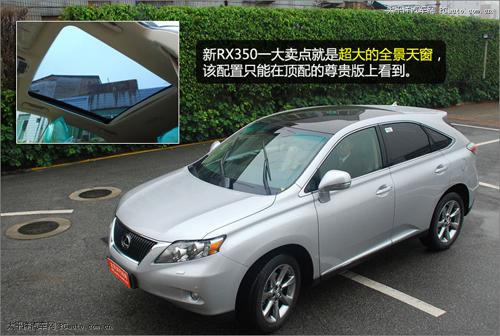從高處俯瞰新RX350,長890 mm,寬800 mm的全景式天窗映入眼簾。這樣的設(shè)計可以讓后排乘客也可充分享受到陽光的滋潤。值得一提的是,該項配置僅可在售價達(dá)85.2萬元的RX350尊貴版上看到。