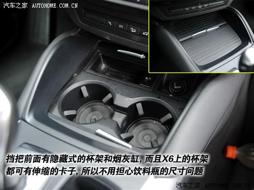 X6對后排乘客的照顧顯然要超過其他車型,為什么呢?后排只能乘坐兩個乘客,還不應該更重視一些嗎?座墊被一分為二,中間部分是巨大的儲物槽和兩個水杯架。而在坐、座墊的兩側,還各設計了一個儲物槽,雖然空間不大,但放隨手的東西還是挺方便的。