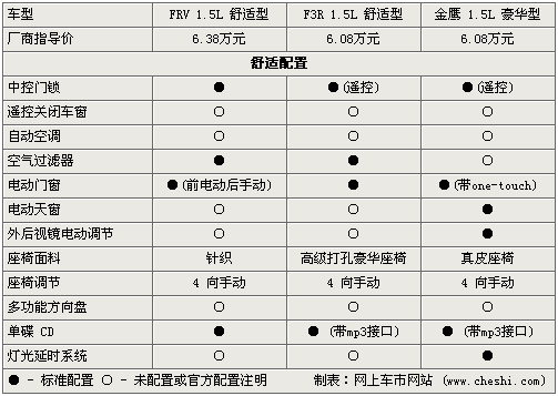 在舒適配置方面,三款車型中吉利金鷹明顯高出一截,遙控門鎖、電動門窗及電動天窗都為標配,并且座椅也為真皮材質。而駿捷FRV采用前電動后手動的設計有些不應該,并且座椅也只為針織材質。三款車都標配了單碟CD,滿足消費的娛樂需求。