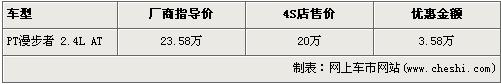 據北京克萊斯勒經銷店銷售人員介紹,近期購買PT漫步者的消費者可以得到3.58萬元的優惠。在售的PT漫步者為2.4L自動檔車型,售價為23.58萬元。經優惠后,PT漫步者的售價從23.58萬元下降到了20萬元。銷售人員還說,店內現車顏色主要是黑色和銀色,欲購買其他顏色的消費者需交定金1萬元,最快下周就可提車。