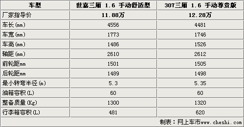 東風雪鐵龍世嘉三廂1.6手動舒適型和標致307-1.6手動舒適型都可以稱得上是該車款中的主力車型,兩款車型的定價相差了4000元整。在車身尺寸方面世嘉三廂車長和車寬方面都要優于標致307尺寸。兩款車型的軸距均在2600mm左右,該尺寸在同級別車型中比較少見,完全可以滿足一般乘客的使用需求。307的車身高度達到了1526mm,這一點保證了其內部高度的寬敞。標致307的行李箱容積達到了620升,可以稱上是海量了,而世嘉三廂僅達到了481升。標致307的前后輪距都要大于世嘉三廂,意味著標致307操控性要優越于雪鐵龍世嘉。