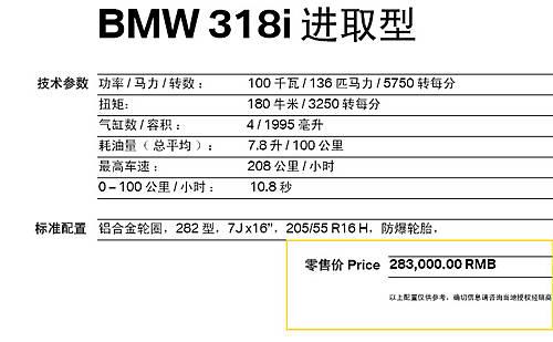 記者近日獲悉,作為國產寶馬3系第5代車型的入門款車型,寶馬318i進取型已經悄然上市。該車的售價為28.3萬元,相比09年初上市的318i領先型轎車的30.6萬元價格下調了2.3萬元。