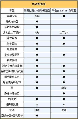 從上面表中我們看出,三廂世嘉舒適型不僅采用了真皮方向盤、真皮坐椅,而且標配了倒車雷達和定速巡航,這在同級別車型中還是少有的,如果你經常跑高速,定速巡航還是非常實用的。除此之外,三廂世嘉號稱世界上最復雜的中央集控式方向盤整合了多媒體控制、定速巡航、空調控制、音量控制等功能,幾乎可以讓你做到手不離方向盤操作一切功能的程度。大大提高了行駛安全性。這一點是科魯茲無法比擬的。