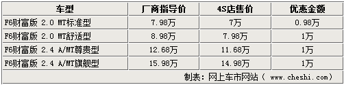 據銷售人員介紹,目前比亞迪F6財富版全系可最高優惠萬元現金。在售車型涵蓋4款車型兩個排量,2.0L的兩款手動車型以及2.4L的兩款自動檔車型。購車同時還有部分內外裝飾或保養優惠贈送。