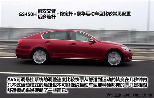 GS450h上裝配的AVS適應(yīng)式可調(diào)懸掛系統(tǒng),可以自動連續(xù)調(diào)整減震器的阻尼。當然,也可以通過人工設(shè)置,分為普通和運動兩種狀態(tài)。普通模式下,懸掛和減震系統(tǒng)更多的顧及車內(nèi)舒適程度,偏軟的懸掛和松軟舒適的座椅讓駕駛員很難有想深踩油門的沖動,大部分的路感被懸掛系統(tǒng)吸收,傳進車內(nèi)的只有少數(shù)幅度稍大一點的波動;運動模式下的懸掛系統(tǒng)表現(xiàn)得相對更敏感,對路面信息的傳遞也更清晰一些,但還談不上純正的運動車型的那種硬邦邦的懸掛調(diào)校,畢竟這不是那一類型的車。