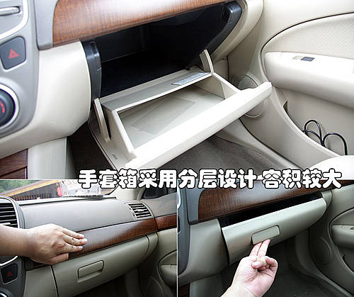 東風日產新軒逸的手套箱有阻尼設計,在打開手套箱后不會因重力而自由下落,手套箱容積比較大,并采用分層設計,可存放不少物品。