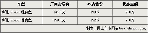 據經銷商處銷售人員介紹,目前國內在售的奔馳GL級分為GL450 經典版與GL450 尊貴版,近日奔馳GL系的最高優惠9.8萬元。經9.8萬元優惠后,低配的GL450經典版售價降到了138萬元。高配的尊貴版經7.8萬元優惠后,售價從159.8萬元降到了152萬元。