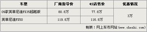 據英菲尼迪4s店銷售人員介紹,目前店內銷售的FX系列有FX50和09款FX35兩款車型,并且近期都有3萬元的優惠。經優惠后,英菲尼迪FX50售價從119.8萬元降到了116.8萬元。09新款的FX35超越版售價也降到了77.8萬元。