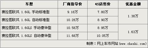 據(jù)經(jīng)銷商處銷售人員介紹,賽拉圖歐風(fēng)全系最高出現(xiàn)了最高1.63萬(wàn)元的優(yōu)惠。賽拉圖歐風(fēng)在售的有4個(gè)車型,入門級(jí)的1.6L手動(dòng)標(biāo)準(zhǔn)版的優(yōu)惠金額為1.38萬(wàn)元,售價(jià)從廠商指導(dǎo)價(jià)9.18萬(wàn)元降到7.80萬(wàn)元,1.6L豪華版的手動(dòng)版和自動(dòng)版車型都經(jīng)全系最高1.63萬(wàn)元優(yōu)惠后,售價(jià)分別降至8.95萬(wàn)元和10.05萬(wàn)元。